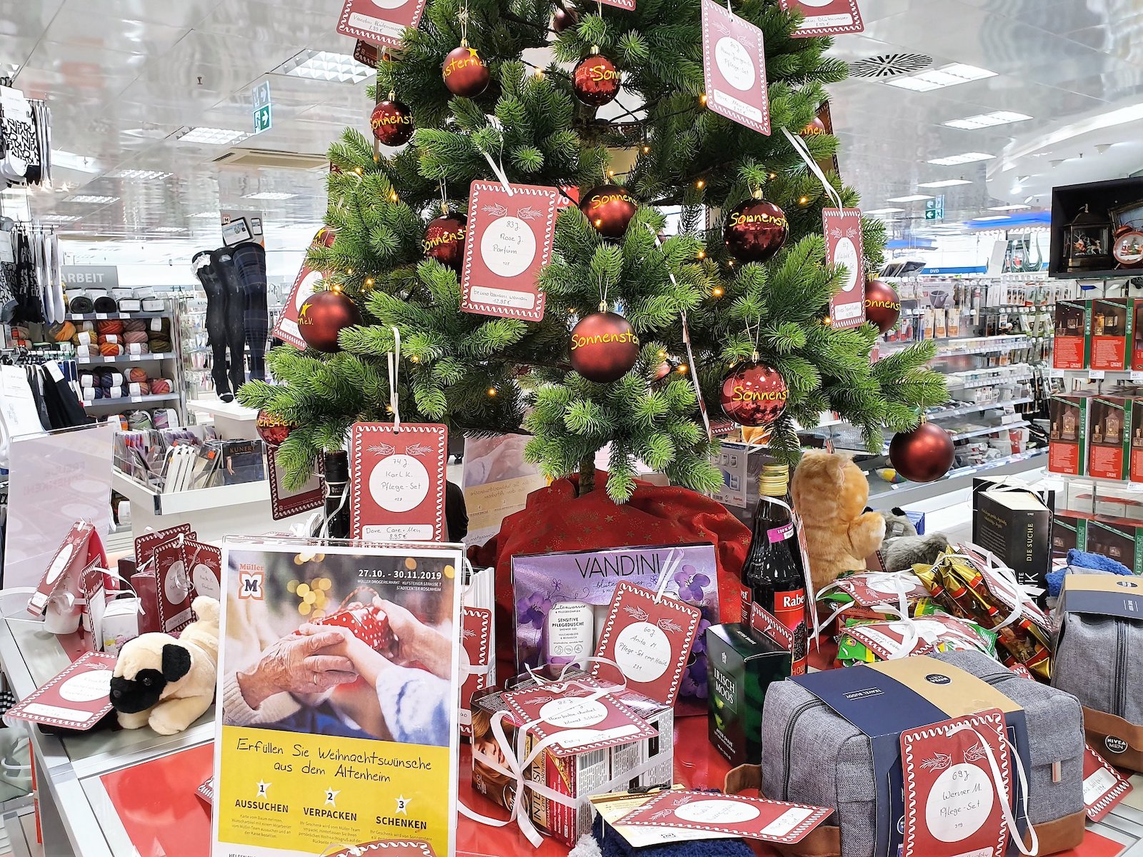 Natürlich kommen wir nie mit leeren Händen. Zu Weihnachten erfüllen wir kleine Herzenswünsche der HeimbewohnerInnen. Dieses Jahr wurden die vorher individuell ausgefüllten Wunschkarten an einem Weihnachtswunschbaum im Drogeriemarkt Müller angebracht. Die Geschenke können von den Kunden des Drogeriemarkts vor Ort direkt ausgesucht werden. Übergeben werden diese dann an den Sonnenstern-Weihnachtsfeiern in den Alteneheimen.
